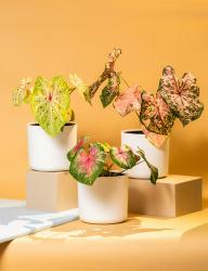 Caladiums are tropical plants originally from the Amazon River basin, though they can be grown in pots and planters in Missouri, too! Preferring a warm, humid climate, caladiums can last from late spring through early August. The leaves come in an array of variegated combinations of green, white, pink and red. The two types are categorized by leaf shape: fancy-leafed with heart shaped leaves, or lance-leafed with narrow, elongated leaves. In contrast to coral bells, caladiums tend to produce brighter colors with less sun.