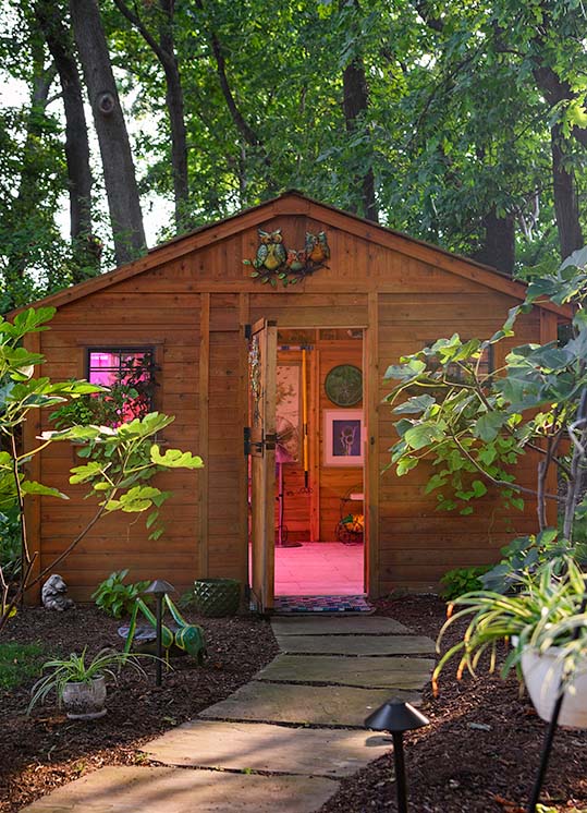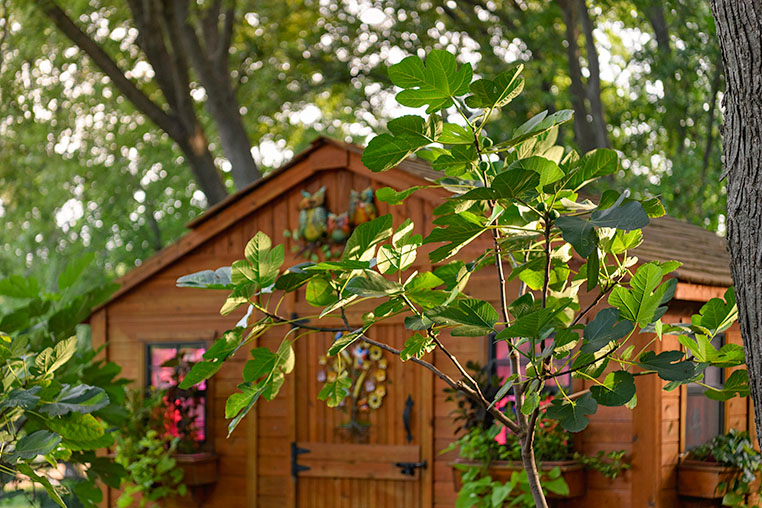 A cedar gardening shed, complete with charming window boxes, serves as a separate landscape attraction, bringing its own charm to the landscape. “I got it as a kit and my lawnmower guys put it together. I decorate it with all the kitschy stuff you wouldn’t put in your house,” she says with a laugh. “I can go out there and feel like I am on vacation.” Complete with heat and grow lights on timers, the shed serves as a place to over-winter the fig trees that enhance the patio in warm weather months.