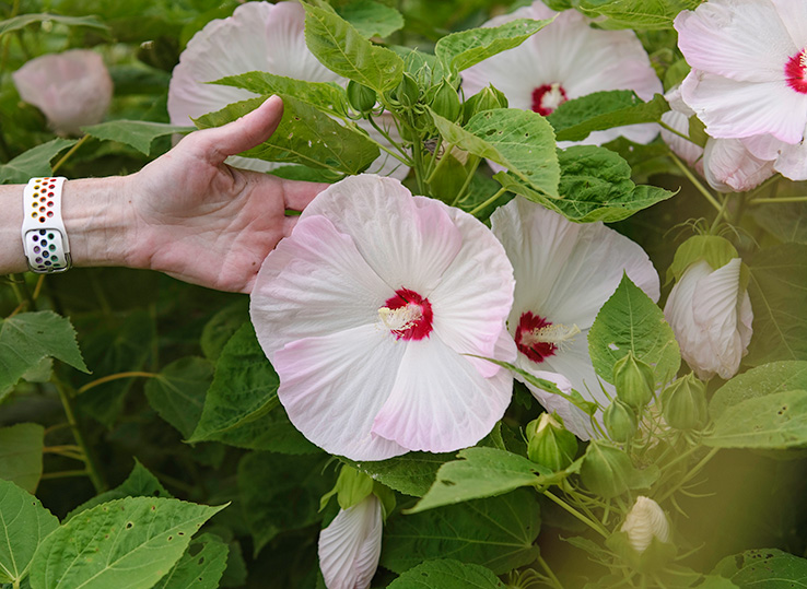 She is surrounded by the rich sunset hues of hundreds of daylilies, mounds of purple and gold created by plantings of different coneflower varieties and scarlet-centered, blush-colored hibiscus blossoms the size of giant saucers. All those vibrant, jewel colors are offset by the sparkling emerald green of approximately 350 lush-leafed hostas.
