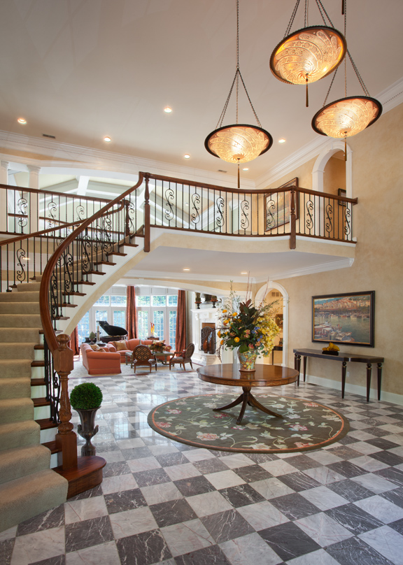 First on the agenda was replacement of the entry doors. Although impressive, the original entry was all-glass and allowed a direct line of sight to the rear of the home. Rich walnut doors now add beauty and privacy to the massive two-story foyer. Wrought-iron spindles line the gracefully curved staircase and catwalk, and the foyer’s traditional chandelier was replaced with four stunning, handcrafted Fortuny fixtures, suspended at varying heights.