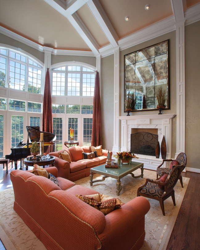 Reupholstered in apricot, the sofas are arranged on an iridescent Kaim-Kisner sculptured silk area rug from New Zealand. Formerly stark white, the columns and woodwork were softened to a creamy tone, and an intriguing faux technique – applied tissue paper, painted in sage with a chocolate glaze – gives delicate texture to the walls. The cherry floors were darkened for contrast and a huge antiqued mirror hangs above the fireplace, which showcases a marble surround and custom screen by Perpetua Iron.