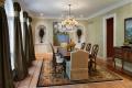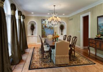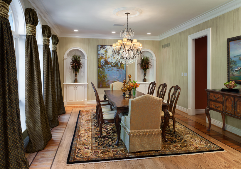 Accessible from the foyer, the wood-lined study and formal dining room are paradigms of understated elegance. Many of the furnishings in both spaces were previously owned by the homeowners and have been blended with stylish new pieces – for example, a crocodile leather sofa and coffee table from KDR Designer Showrooms in the study and comfortable head chairs, upholstered in a muted animal pattern and trimmed in crystal, for the dining table. Christi particularly enjoyed designing the home’s unique window treatments, noting that the drapery embellishing the dining room’s architectural windows is her favorite.
