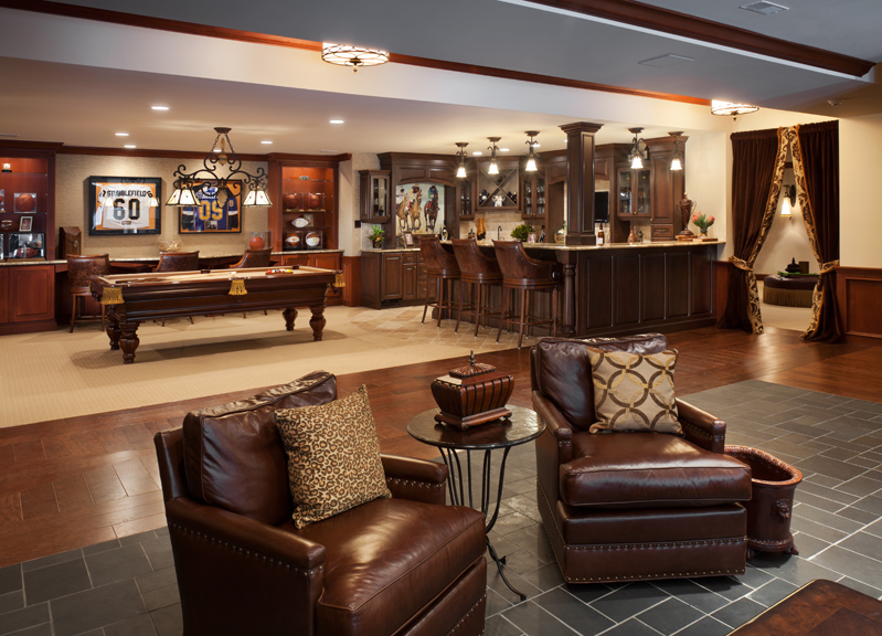 Stretching the full width of the home, the lower-level entertainment area was renovated to fit the homeowners' request of a more open layout. In the original floor plan, the various spaces were accessed from a hallway that was essentially a long, dark tunnel. “We opened the entire space,” Christi explains, and it’s now “hospitality central,” where dozens of guests can simultaneously enjoy the fireside gathering area, billiard/shuffleboard/card tables, AV room, full kitchen and bar. The husband’s only stipulation was “TVs visible from every vantage point."