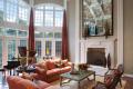 In the step-down two-story great room, floor-to-ceiling windows offer commanding views of the pool area, outdoor kitchen and tennis court, and the Italian silk drapery was designed to accent the windows without impeding the view.
