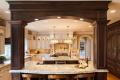 To better fit the homeowners' personal style, the kitchen was completely renovated. An exterior wall was removed and extended, and two arches were added to integrate the kitchen with the hearth room. Culinary activity revolves around an 8-foot work island, topped with Arctic Pearl granite and illuminated by drum lights.