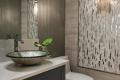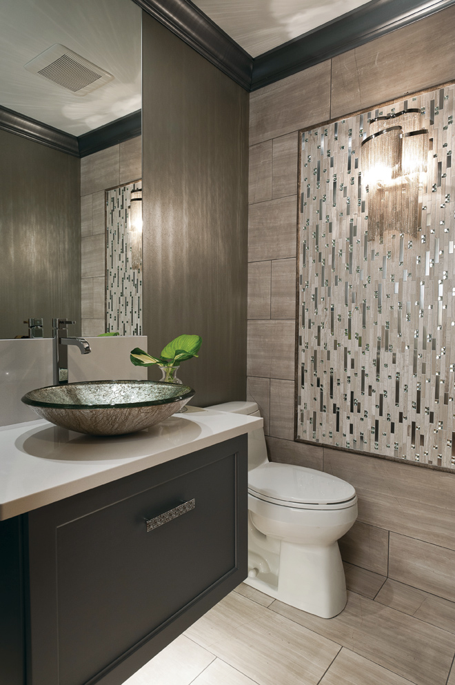 Stepping in to the 30-square-foot powder room, your eye is immediately drawn to the dramatic platinum tile mosaic. K-Build Design conceptualized and executed this stunning bath. Bordered in a deep-gray marble to coordinate with the Martha Stewart paint collection Thundercloud on the floating vanity and trim, the tiled wall adds a unique art element to the small space. The veined-marble floor climbs up the wall and frames the mosaic piece. The custom vanity allows for plenty of storage. The powder room is lit by a combination of a Eurofase sconce with soft LED lights under the vanity and one 4-inch LED can light on separate switches. Platinum accessories complete the polished look.