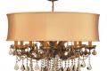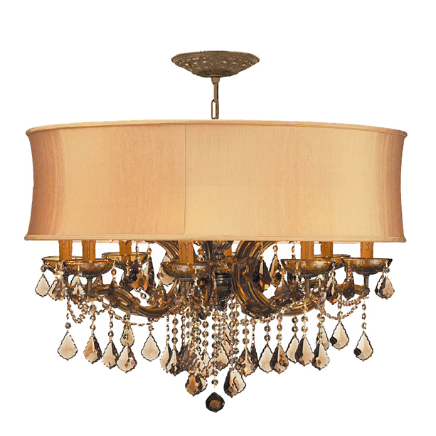eight: Chandelier draped in golden teak hand-cut crystal accented with a harvest gold silk shade, available at Ooh La La.