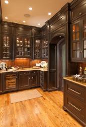“We designed around the concept of the cabinetry,” says Salinas of Gegg’s custom work. Dark-stained walnut exteriors complement lighter lyptus interiors and a unique wooden backsplash. “Mixing painted wood with lighter stained wood,” explains Salinas, “is a simple way to give newer houses the feel of history. Anybody could have thrown in a stone backsplash, but carved wood panels – they’re so reminiscent of the beautiful Westchester tutors.”