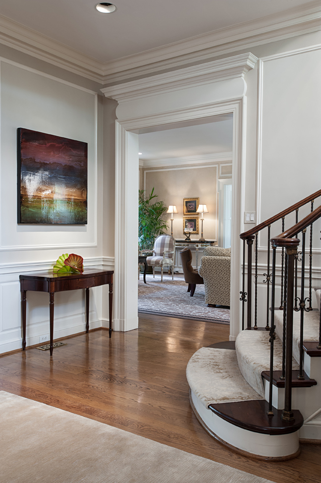 Original to the house, the foyer’s majestic curved staircase showcases a graceful walnut and wrought-iron balustrade. Sandra removed the wallpaper, enhancing the airy quality of the space, and chose custom-made Tibetan Lapchi carpeting for the staircase runner and landing. Adding visual interest, a late 18th century mahogany gateleg card table from Clark Graves Antiques displays a Chihuly glass piece, and two vivid paintings by St. Louis-based artist Michael Hoffman flank the arched entrance to the adjacent library.