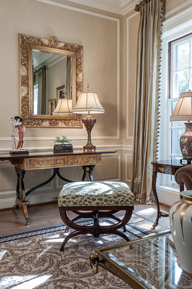 To the right of the foyer is the formal living room, where Sandra made an elegant design segue with matching short sofas positioned at each end of the room and upholstered in warm brown antique striae velvet. Trimmed with ball fringe and crystal, the subtly striped draperies are slightly puddled, and two French chairs, antiqued and covered in a windowpane raw silk fabric, blend beautifully with the full-size Wilton rug. Cocoa-toned leather wing chairs bracket the fireplace, and additional furnishings include another gateleg card table, a drop-leaf lyre-legged desk inlaid with burled yew, and a tasteful array of antique tables and lamps.