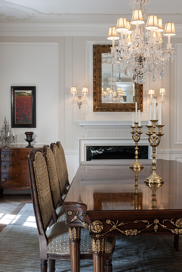 With its gleaming herringbone-laid oak floor, the dining room creates an elegant ambience for formal meals. Seating up to 12, the table is an E.J. Victor masterpiece with mahogany solids, walnut veneers, and ornamental apron onlays. The European beechwood dining chairs were upholstered in a new velvet-&-linen fabric by Lee Jofa; Schumacher silk draperies, with crocheted edging and crystal trim, line the casement windows; and Barbara Barry’s carpet design inspired the medallion and ceiling treatment by artist Roland Breckwoldt.