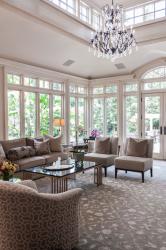 The only significant structural addition, the vast family room further demonstrates the owners’ respect for their home’s architectural styling. Fixed, wood-clad casement windows are topped by a classic clerestory, and the arch motif is faithfully repeated. “Casual, but dynamic,” the pendant-trimmed chandelier has floret bobeches, and the silk-&-wool rug is woven in a traditional Lapchi pattern. Surrounding an Asian granite-topped cocktail table are a Baker sofa covered in neutral-toned velvet, armless chairs in a sophisticated linen/cotton ticking, and club chairs that swivel for conversation or TV viewing.