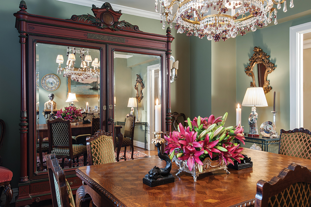 The home is well-appointed, exhibiting the couple’s traditional aesthetic through a continental mix of French, English and Georgian styles. Antiques and collectibles spanning over three centuries make up most of the decor, treasures that were amassed over decades of traveling for business and pleasure. “I’ve done a lot of business in Asia over the years,” says Boyson, “and vacation for us was always about shopping.” Their favorite destinations for finding great pieces? Paris and Italy, specifically Florence, Venice and Rome.