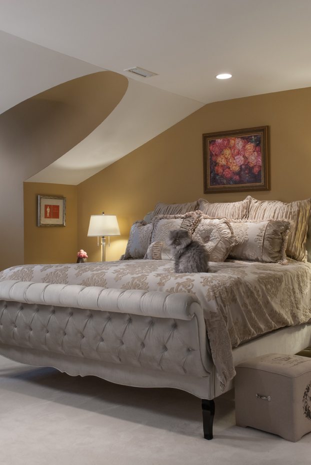 Upholstered in tufted platinum velvet, the sleigh bed is enhanced by a medallion-motif damask comforter and decorative pillows in complementary tones. An antiqued mirror nightstand serves as a side table between transitional-styled recliner chairs in textured champagne cotton, and contrast is provided by an espresso-finished highboy and dresser, topped by a baroque-shaped mirror.