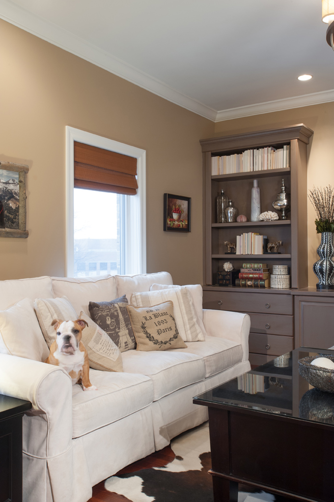 Tank, the couple’s English bulldog puppy, excitedly welcomes visitors to the family room. Open to the kitchen, this haven is comfortably furnished with a dove-white microfiber sofa, an oversized coffee table from Restoration Hardware and linen-covered side chairs that swivel for TV viewing.