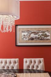 In the dining room, rich brick-red walls provide a dramatic background for the espresso-stained mahogany pedestal table, sleek dining chairs in tufted oyster velvet and a classic buffet and china cabinet. Mementos from the owners’ travels, accent pieces include a table runner from Bali; an ebony and mother-of-pearl centerpiece, crafted by artisans whose ancestors inlaid the Taj Mahal; a framed embroidered silk from Beijing, and a hand-painted tea service from Romania.
