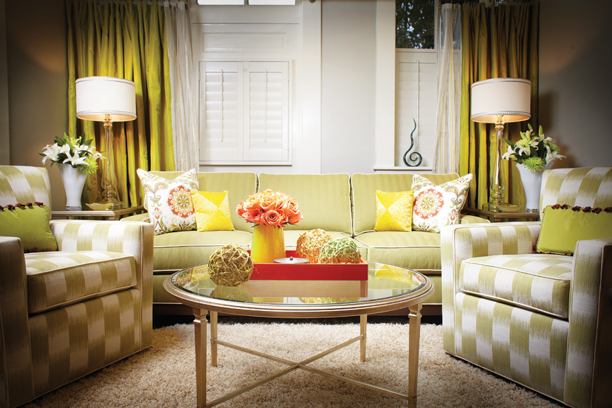 The biggest challenge the designer faced was the window treatments. Because the home had been divided into multiple units, the front façade had off-center windows and old doorways that had been closed off. From the inside the living room and dining room windows weren’t symmetrical. To mask the asymmetrical look, Kenn created a window treatment in chartreuse green silk that extends all the way across the wall. The use of a bright lemon sheer lining sewn to the ends of the larger panels gives a contemporary effect.
