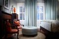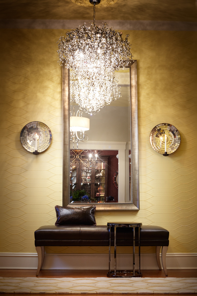 The entrance to the room includes a cozy reading nook where Leah loves to curl up with a good book. The original light fixtures were kept intact and Kenn mimicked the fixture's scroll in the wallpaper. The flocked paper has the feel of an older era, but it is more contemporary with the metallic finish and sand instead of velvet – just another way Kenn juxtaposes a contemporary atmosphere in a historic space.