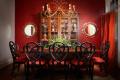 A similar window treatment is used in the conjoining dining room. The focal point of the space is the faux Venetian plaster wallpaper in a rouge red. “This is one of the ways I hearkened back to the history of the property while creating an opportunity for a more contemporary pattern and texture,” Kenn explains. The wall serves as the backdrop for family gatherings around the Ethan Allen dining table. The ariel chairs, also from Ethan Allen, flow seamlessly with the dining room chandelier, which is a real nod to the past with its design evoking an Art Nouveau motif.