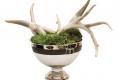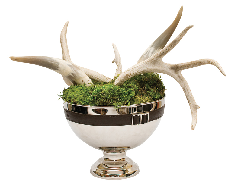 ten: Silver bowl centerpiece with moss and real horns, available at MKS.