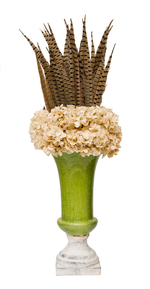 fifteen: Green vase with real feathers and hydrangea, available at MKS.