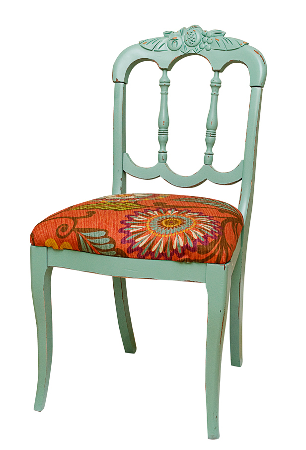 nine: Aqua chair with floral fabric seat, available at Emporium St. Louis.