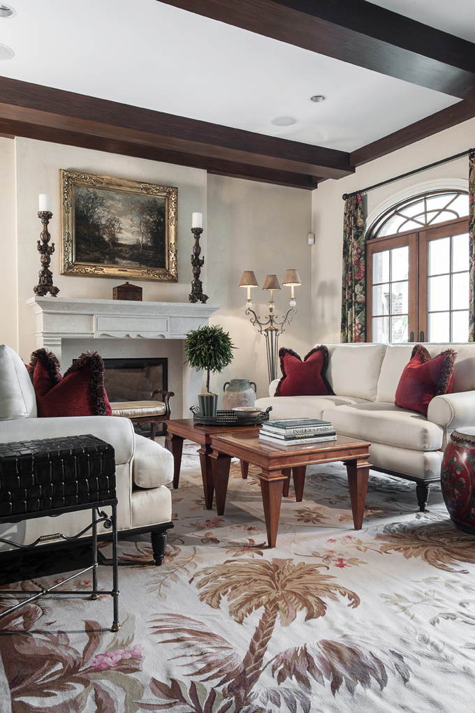 A smartly placed dry bar connects the library to the living room and provides a nice flow to the home when entertaining. Hand-trowelled plaster walls, a travertine floor and dark-stained ceiling beams enhance the Old World ambience of the living room. The crushed-limestone fireplace was made locally, and careful attention was given to the proportions. Two antique candlesticks decommissioned from a church in Europe and purchased in New Orleans sit atop the mantel. Also brought from the owners’ previous home, two sofas covered in a crisp cotton rayon face one another. “The texture on the sofas is beautiful and elegant against the texture on the needlepoint rug,” Rohan points out.