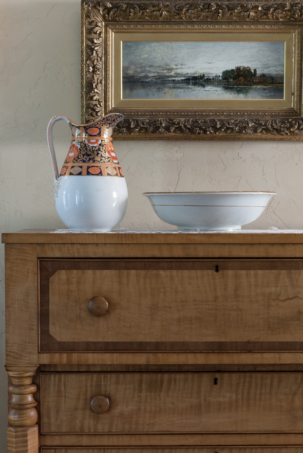 Other special pieces in the space include three Spanish leather panels that were once a large screen, as well as a Kentucky maple chest with an antique pitcher and bowl. While elegant and stylish for entertaining, the living room is all about bringing the outdoors in through two sets of French doors that lead to the covered patio and courtyard.