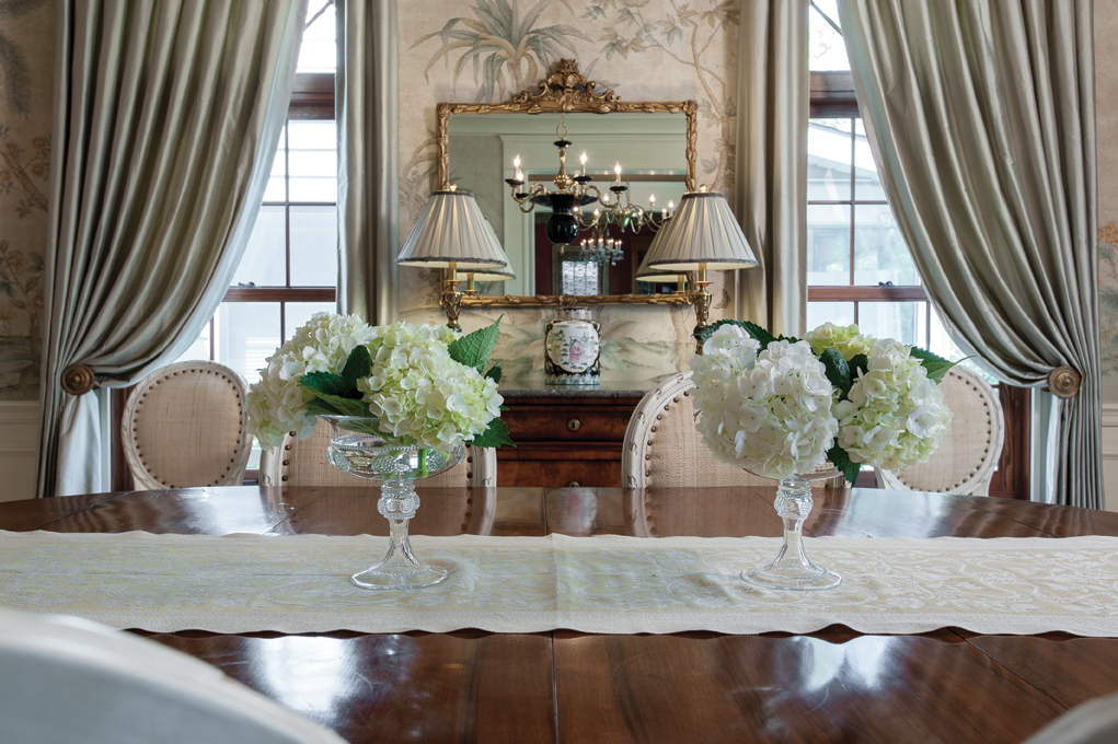 Just to the right of the entry, the dining room’s hand-painted wallpaper is a showstopper. The organic print reflects the homeowner’s love of gardening and nature, while the subdued colors pop against the soft, streaked glaze of the woodwork and trim. An antique chest from Clark Graves Antiques is nestled between two windows letting in abundant amounts of natural light. Lush, silk draperies perfectly complement the exquisite wallpaper.