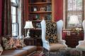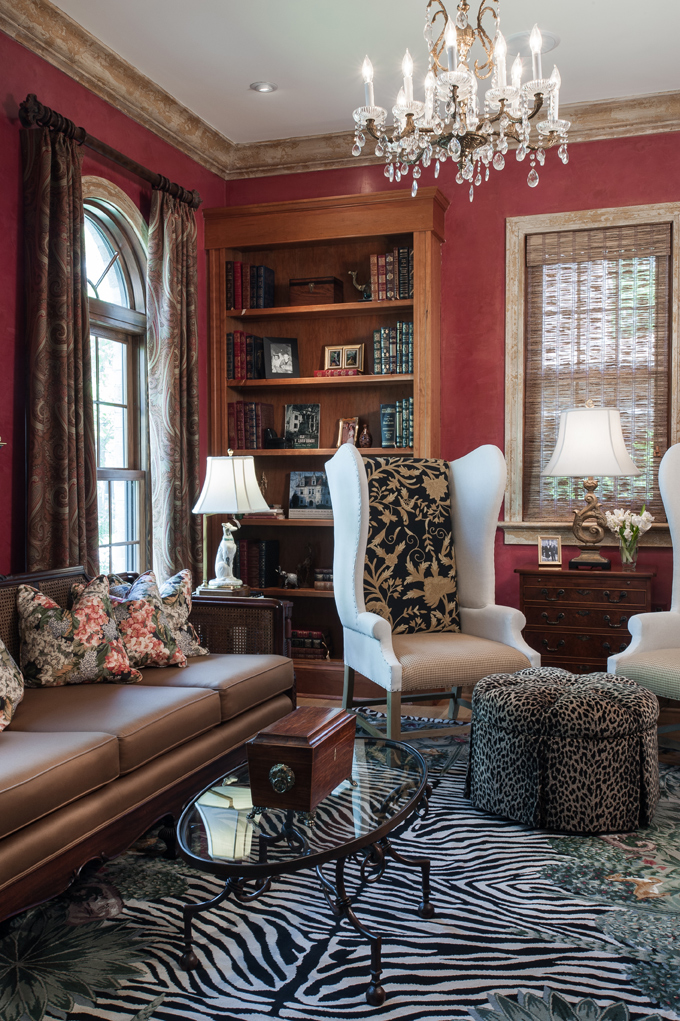 Across the entry from the dining room is the library, which was inspired by a red room the homeowner saw in a magazine. “Janice helped me to find the inspiration from the room in the magazine and bring it to life in this space,” the homeowner says. The red walls are done in a Venetian plaster treatment and have a soft sheen against the rustic finish of the painted molding. A wool, needlepoint rug from the homeowner’s previous home pulls in all the right colors – camel, black, cream and green.