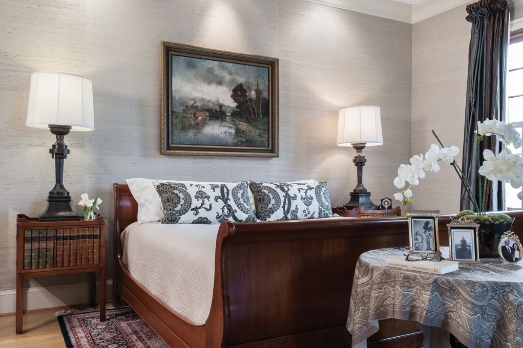 Access to the second story is just off the kitchen. French doors lead to the peaceful master suite. The Oriental rug was the basis for the room’s design and is from the dining room in the owners’ previous residence. Two-toned silk draperies are a lush contrast to the neutral grasscloth wallpaper. An octagonal dressing and closet area with gray-mirrored walls connects the bedroom to the master bath.