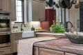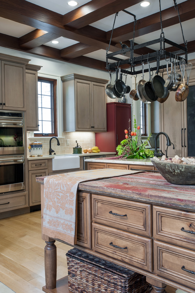 Neutral finishes in the adjoining kitchen provide a calming effect. The gray-washed wood cabinetry complements the beautiful quartzite island top and hand-glazed, crackled porcelain splash tiles. A salvaged barn-wood countertop from St. Joseph, MO, brings in an element of texture.