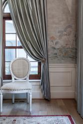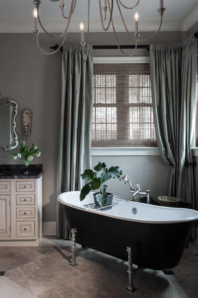 Silk draperies, a black and pewter soaking tub and antique mirrors amp up the glamour in the feminine master bath. “I like to mix masculine and feminine aspects into all the home’s I design,” Rohan notes. "Part of the aesthetic of eclectic design is that you can marry different design elements even if you are not sure they mix well. It takes the experience of a designer to do it successfully."