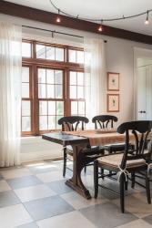 The breakfast room is a versatile space for both family dining and entertaining. Sheer drapes let in light from the courtyard. “The draperies add softness to the breakfast room and kitchen,” explains Rohan. “I think they also help to raise the style in the space to another level.”