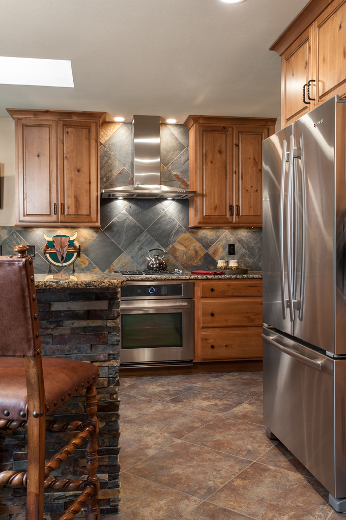 The kitchen’s central feature is the smart, stacked-slate peninsula island topped with sleek granite countertops and paired with new stainless-steel appliances. The result is contemporary, tasteful and welcoming. Knotty Alder wooden cabinets set a warm tone, and a counter-to-ceiling slate backsplash provides texture and high-end quality. Plantation shutters in the dining and kitchen areas match the stain on the existing trim.