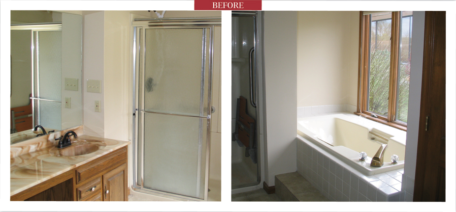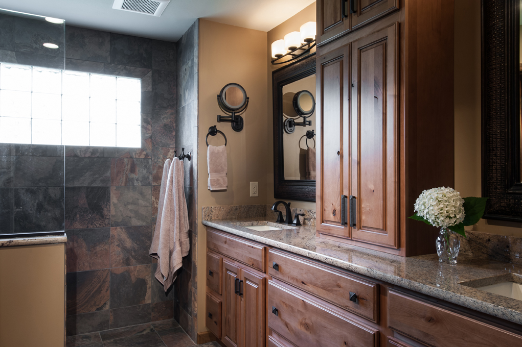 The Master Bath: The master bath was completely redesigned as a custom, mini haven of relaxation. The space continues the theme from the kitchen with slate tile cladding the entire room and a central, double vanity of Knotty Alder cabinetry. The toilet was enclosed for privacy, and the closet was expanded to provide additional storage.