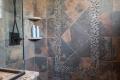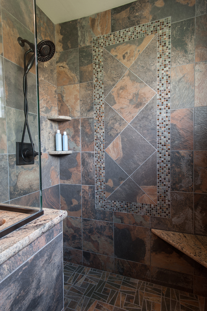 The shower walls are covered in slate with a large, central glass-tile accent. "The tile accents are on the floor,” Kurtz says. “It is a beautiful mosaic pattern in a slate-look porcelain. I added a frame of mosaic with glass and slate accents around the 12”x12” slate turned on diagonal. This is the feature you see as you walk into the shower."