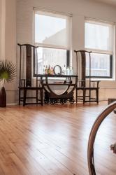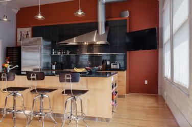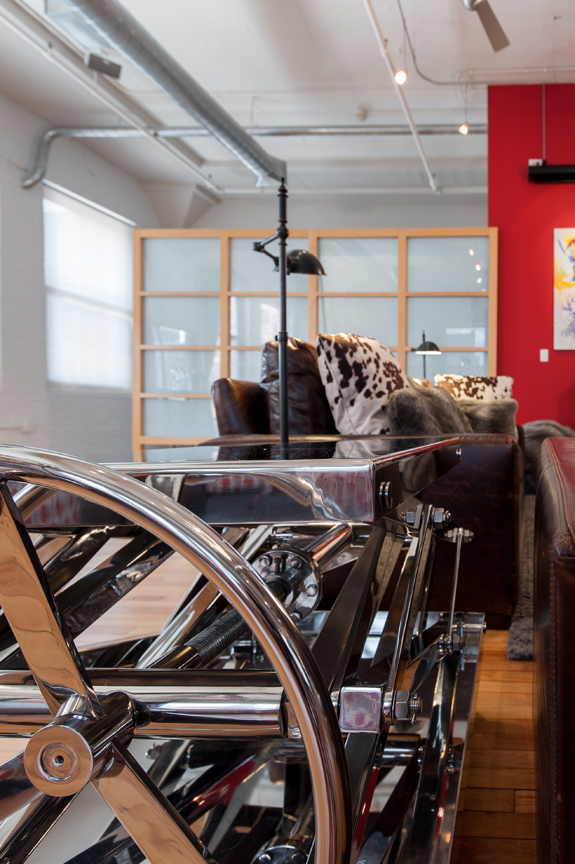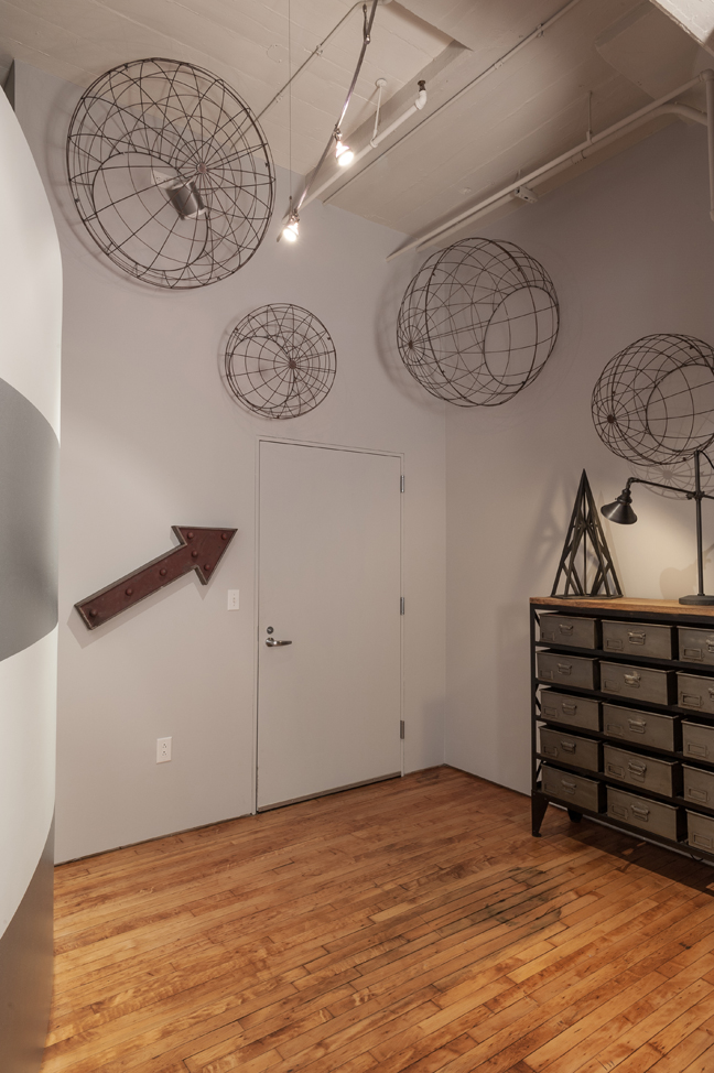 Together, mother and son did virtually all of the interior work themselves, assisted in the “heavy labor” by a team member from Sitelines, owned by Patrick’s friend, Kelly Kenter. First on the list was a complete re-paint of the walls, ceilings, and pipework. Soft gray tones and vibrant accent walls established the color scheme, and wide metallic stripes painted horizontally on the entry foyer’s curved walls forecast the loft’s industrial ambience.