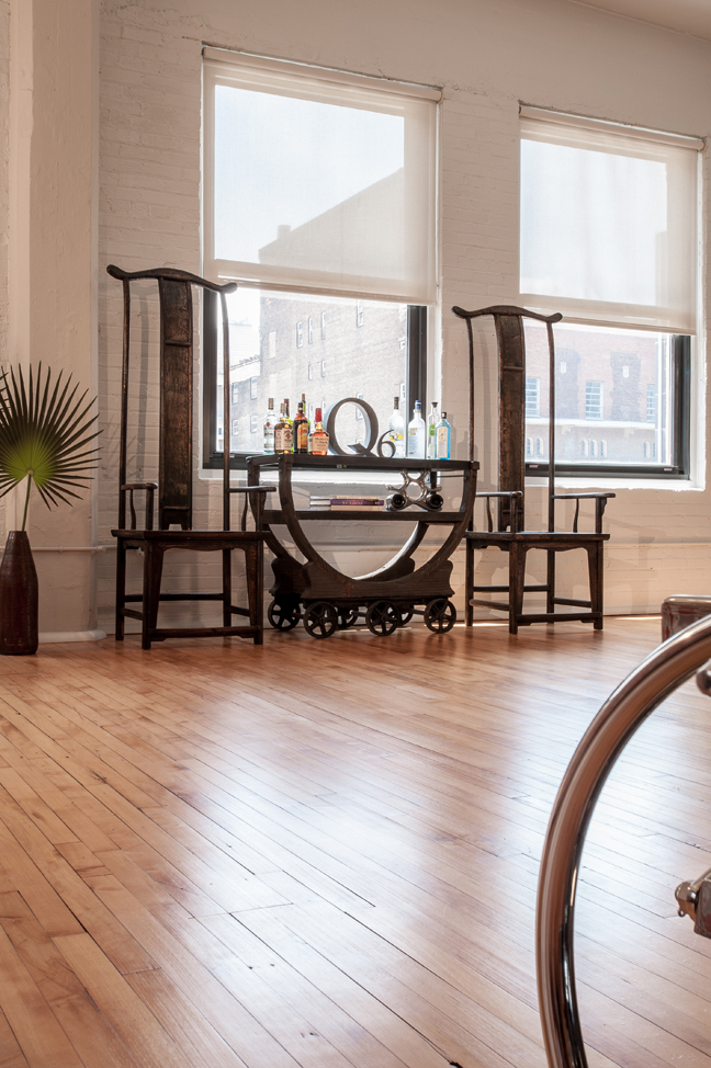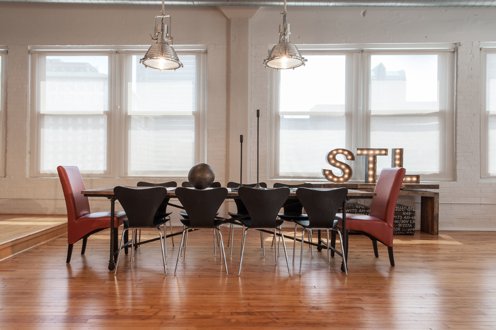 Built as a warehouse in 1913, the 11-story building holds a place in history as St. Louis’ first downtown loft/condo conversion, and Patrick’s residence epitomizes the industrial loft lifestyle – nearly 4,000 square feet of open space, huge structural concrete support columns and towering ceilings webbed with a network of exposed ductwork and conduit. With 15 windows on two sides and panoramic views of the cityscape, Patrick describes it as “my home 10 stories in the sky.”