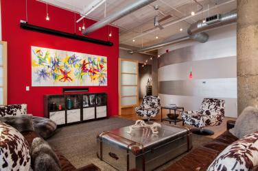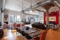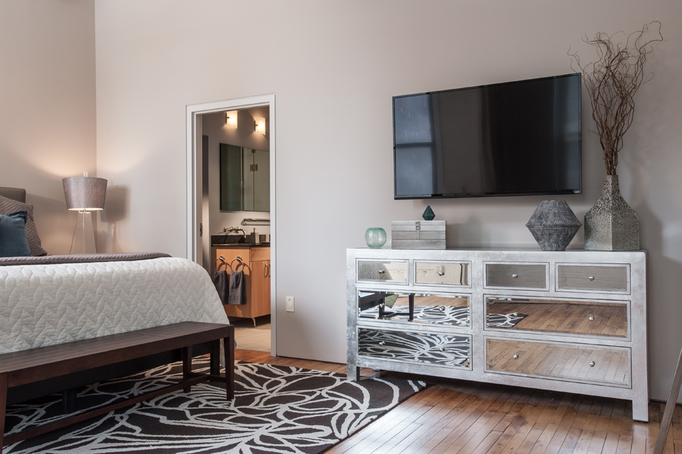 The “living room” area showcases all of Patrick’s passions. Previously owned, low-slung leather couches and a deeply textured rug define the space; a massive metal shipping trunk serves as a coffee table; and Patrick commissioned local artist Dagny Challoner to paint the vivid, 4’ x 8.5’ triptych that dominates the brick-red perimeter wall. A 10-foot screen drops from overhead and an HD Panasonic projection system provides bigger-than-life-size viewing for sports events. Twelve speakers and a SONOS wireless HiFi audio system fill the loft with music that Patrick can control from anywhere on his iPhone. A true technophile, he’s also installed a flat-screen TV in every space.