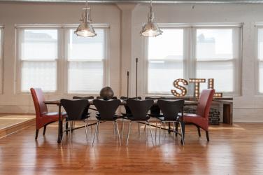 Patrick’s expansive, reclaimed wood dining table was perfectly proportioned for the dining area. New host/hostess chairs in deep orange leather and chrome-and-wood dining chairs provide seating, and huge maritime lights are suspended from the ceiling above. Topped by lighted letters reading “STL,” a wood plank table from I.O. Metro functions as a sideboard.