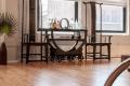 New pieces purchased for the living room included a sleek storage unit with decorative marble panels, two swivel chairs in a simulated cowhide print, a rustic side table from Restoration Hardware and, as incongruous as this may seem, a gleaming surgical table that emphasizes the industrial look and can be adjusted in height for a multitude of purposes.