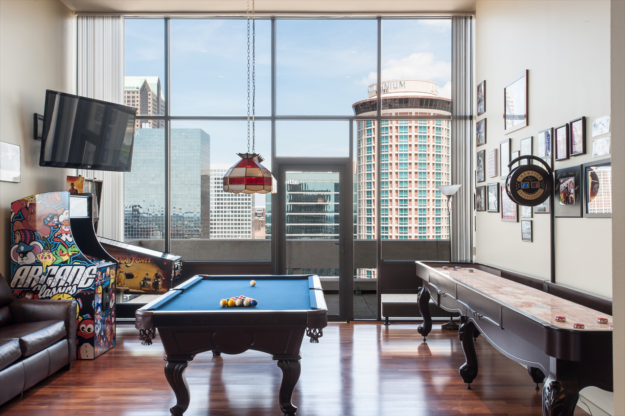 Matt moved into Pointe 400 five years ago, but several months ago an opportunity presented itself to take over a different unit with a large wraparound balcony and the ability to renovate to his liking. Previously the home of former Blues owner Dave Checketts, the two-story penthouse had three bedrooms and three bathrooms on the lower level and a living room, dining room, media room and kitchen on the top level. The space was way more than Matt needed, so the building management allowed him to split the unit into two separate residences. “The building management is very accommodating to your wishes,” Matt notes. “They let you make changes and are easy to work with.”