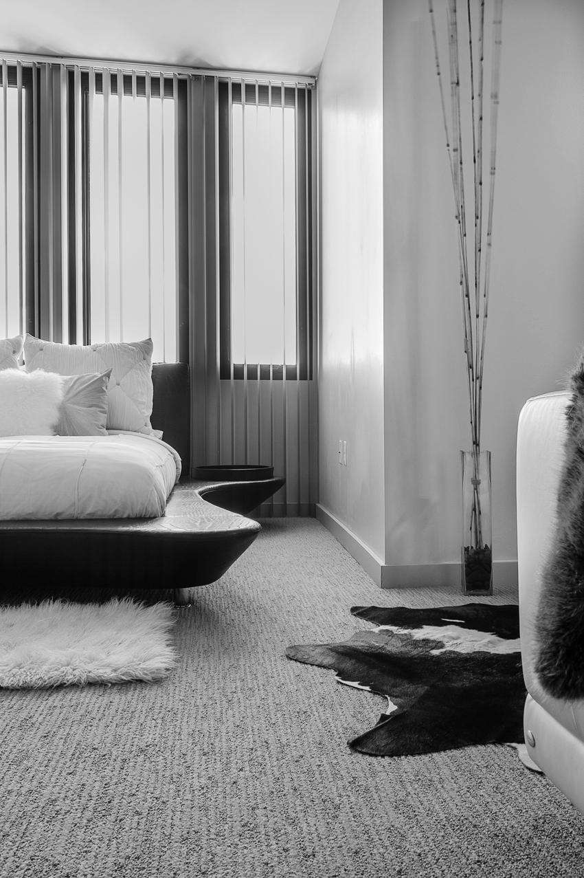 In the open living room a clean, white-leather sectional is softened by textured throws and pillows in soft animal prints. The master bedroom continues the leather and animal-print trend with a black, printed and curved headboard and a hide-on-hair rug.