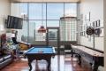 The lower level was kept as it was and converted into guest suites for residents of the building to rent for out-of-town family and friends. Matt, who is a general contractor and owns 220th Builders, transformed the top level into the ultimate sports fan's dream home. Since the top floor was lacking a bedroom and master bath, Matt first added a wall to close in the bedroom space, creating a master suite. Other renovations included adding a guest bath, complete with a shower and tub, as well as changing the configuration of the mechanical room to include a laundry room. New carpet was laid in the bedroom, and the carpet in the entry and office was removed and hardwood was added.