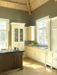 In terms of color considerations, Berry also recommends choosing white or light-colored countertops, and cabinets and backsplashes to brighten and open up the room for small spaces with little natural light. Add warmth and a casual feel to areas located away from heat and water, such as breakfast bars and islands, with wood surfaces. (But avoid mixing "close but missed" finishes when working with multiple woods, such as dark golden-brown floors with dark reddish-brown cabinetry. Berry says save color and drama for select feature areas, such as granite with sweeping movement on large islands and patterned or colorful tile backsplashes, for a clean, polished look.
