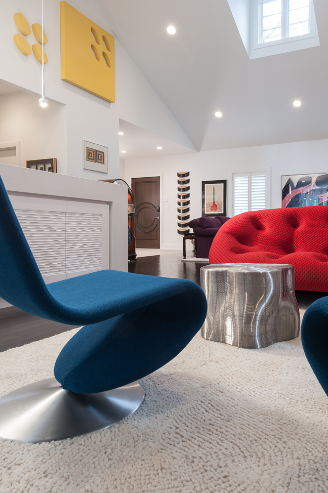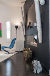 The formal dining area contrasts a handsome Regency dining table and chairs with the adjoining hearth room’s vivid red Ligne Roset lounge, gravity-defying side chairs in marine blue and sculptural steel mesh occasional tables. Cylindrical white sculptures by Brother Mel bracket the inset fireplace and flat screen TV, made nearly invisible against a black wall and a brass Turkish shoeshine stand gleams on the hearth.