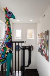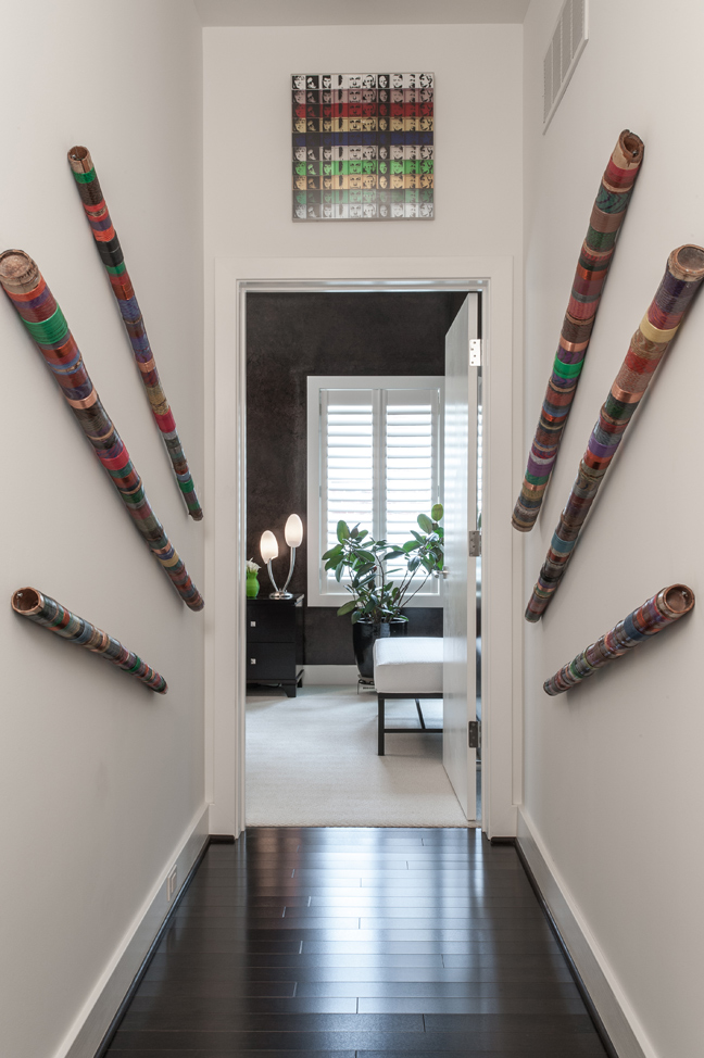 Drawing the eye into the great room are a wall sculpture by Lori Cozen-Geller and Claes Oldenburg’s lithograph, Scissors as Monument. Completely open, the main level’s activity areas are filled with vibrant color and natural light. High-engineered, espresso-hued Mirage hardwood flooring and white walls establish a sophisticated “gallery” effect, emphasizing rather than competing with the stunning artwork.