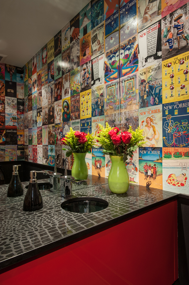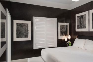 The remaining half of the main level is devoted to the master retreat. Cylindrical sculptures and an Andy Warhol montage line the walls of the hall leading to a powder room, papered with the husband’s collection of New Yorker covers; the owners’ sitting room/library and adjacent home office; and a tranquil, Zenlike master suite. Coffered and sublimely furnished in black and white, the master bedroom’s black walls are quietly embellished with a 10-piece series by Jasper Johns, entitled Numbers.