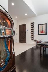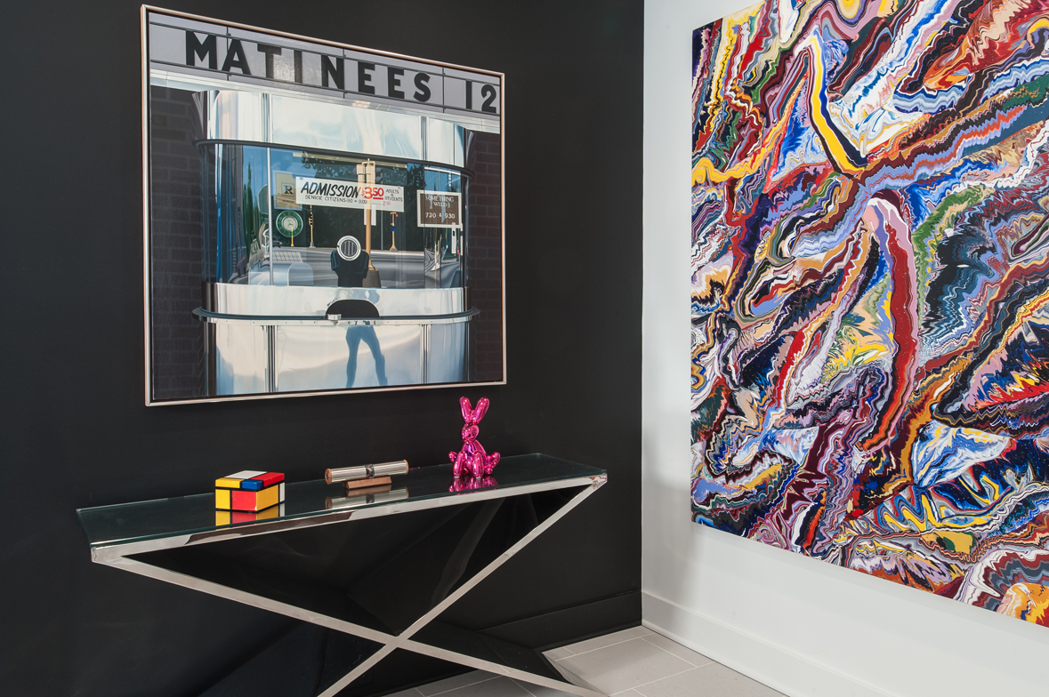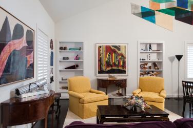 In the great room, for example, a custom-made Tom Britt sofa and cadmium-yellow club chairs are combined with several oriental tables and two antique demilune console tables, one topped by Ernest Trova’s Flowing Man. Displayed in the 21-foot vault are Square Wave, a trompe-l’oeil by Ron Davis, and on the opposing wall, another geometric Cozen-Geller sculpture in brilliant yellow. Below, a quintessential Frank Stella abstract is whimsically hung above a 1947 Wurlitzer jukebox.
